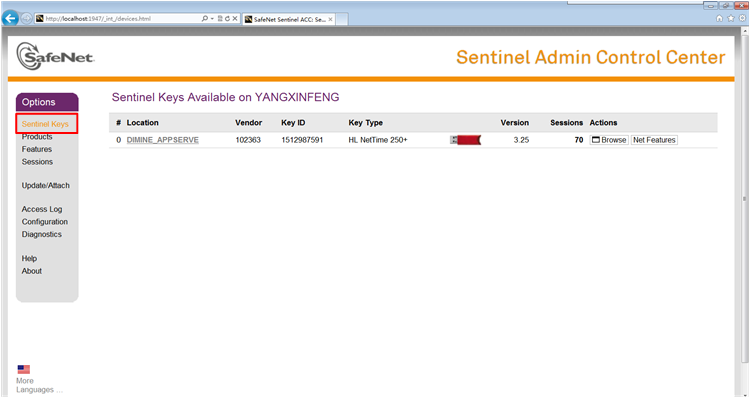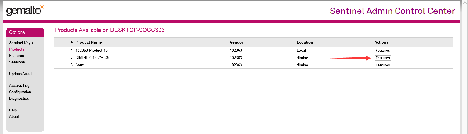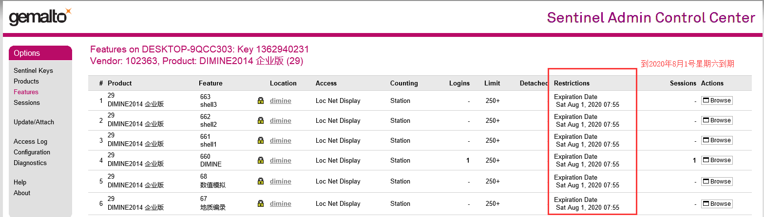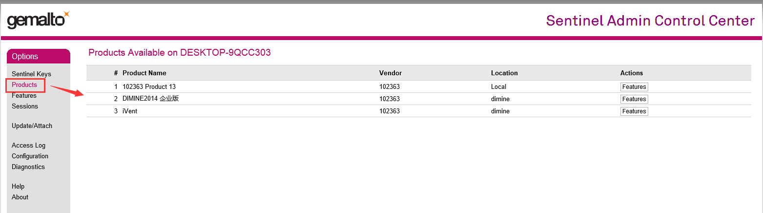 4、點(diǎn)擊相應(yīng)產(chǎn)品后面的features,查看對(duì)應(yīng)加密鎖有效期