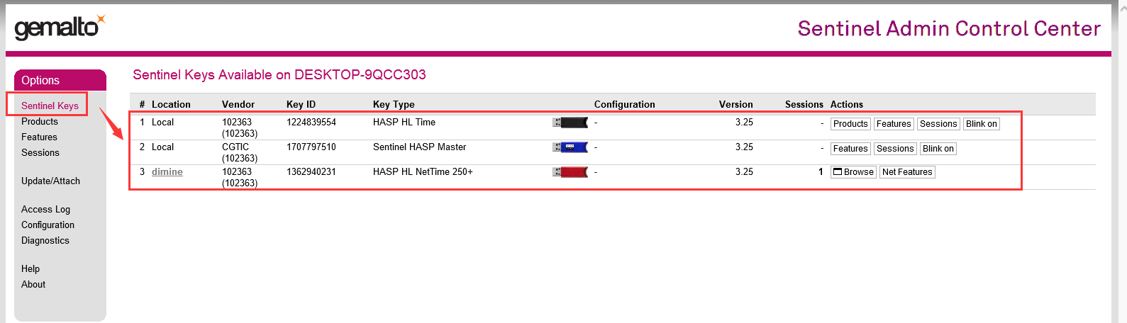 (4)完成上述設(shè)置后,在Sentinel Keys項(xiàng)中可查看硬件加密鎖連接信息,如下圖所示: